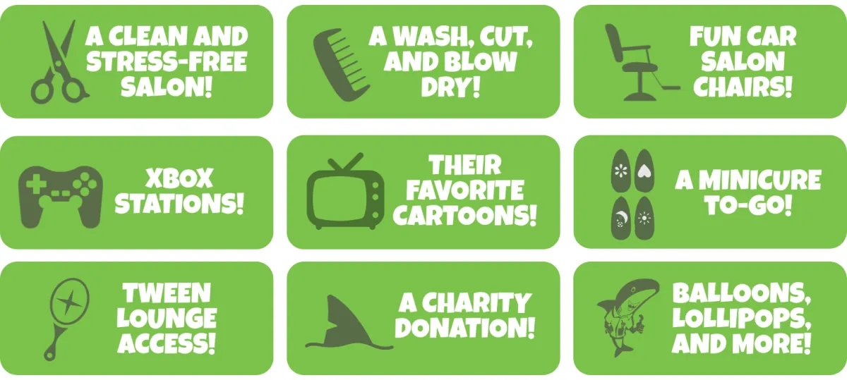 Every Girls’ Haircut includes a wash, cut, blow-dry, a minicure, a glamour ring, fun chairs, cartoons, a balloon, and a lollipop!